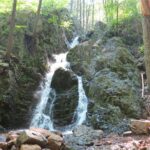 - In 0.25 mile, cross another brook, turn left and follow the brook through a hemlock grove. Because this area is frequently flooded, there is a blue-blazed bypass trail to avoid the crossing of two more brooks in wet weather. The side trail ascends to the right through hemlocks and rejoins the A.T. after 0.1 mile at Fitzgerald Falls.