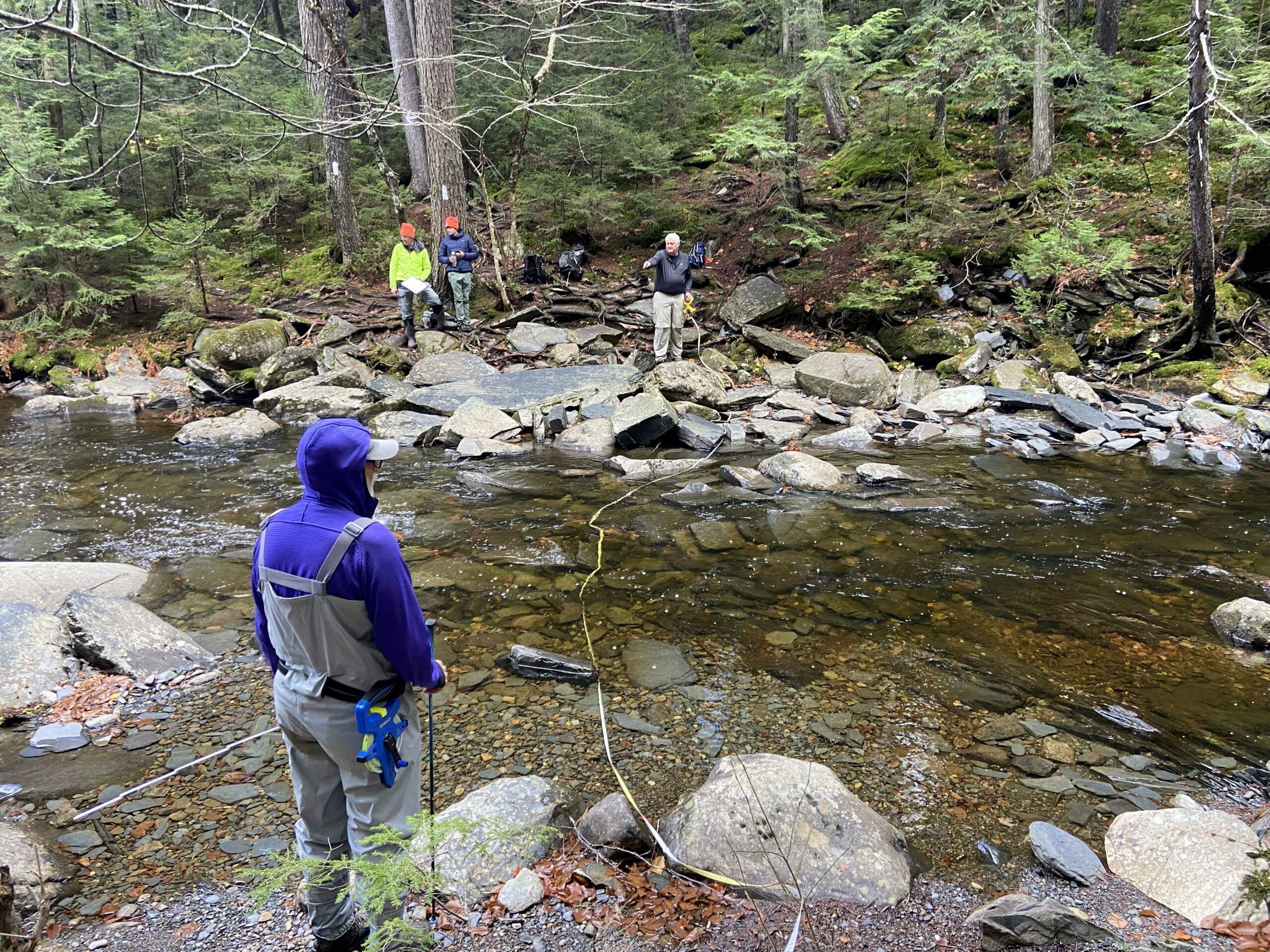 Volunteers with the Maine Appalachian Trail Club and ATC staff assessing the A.T. crossing at Little Wilson Stream. Photo by Leah Beck.