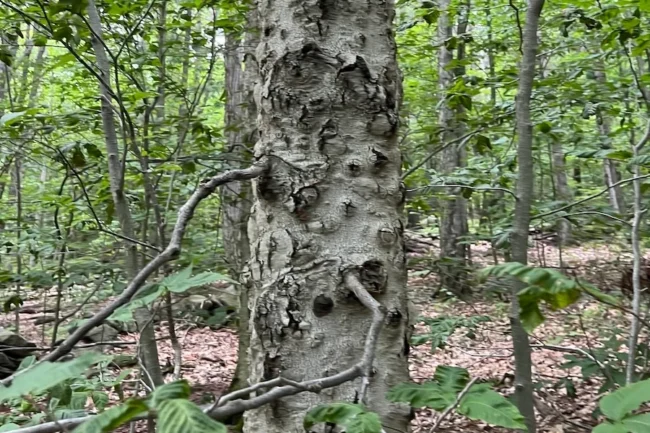 - American beech trees are showing signs of beech leaf disease and beech scale infestation (see photo).