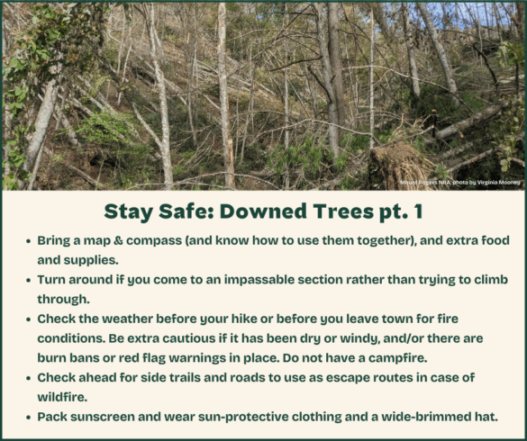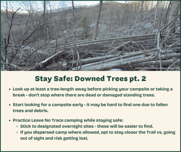 Storm damaged areas are also dynamic. Trees will continue to fall (and have from high winds this spring in the Smokies and southern Virginia). Don’t be afraid to turn around and skip around severe damage. Skipping impassable sections will not impact a hiker’s eligibility for our 2,000-miler program.
