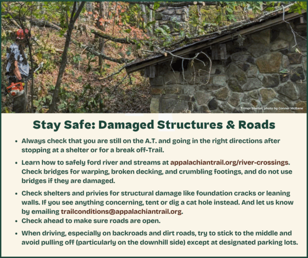 Continue reading for the best ways to plan your A.T. adventure and learn about how to stay safe in areas with storm damage. We will continue to update our Helene Trail Alert with the latest closures and conditions.