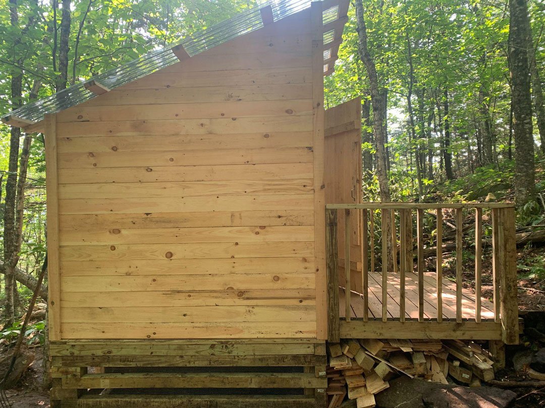 Yet as with most structures along the A.T., continual maintenance and, occasionally, a complete replacement is essential to ensure the privies are functioning properly. This was the case with the Moose Mountain Privy in New Hampshire (NOBO mile 1,763.1). Originally built in 2003, this privy was showing its age after 17 years of use: the floor was beginning to deteriorate, the base logs were rotting, and the seat was broken. More importantly, the single crib* it was built on for containing human waste was full, defeating the purpose of a moldering privy (and leading to the litterbox scenario described above). The old Moose Mountain privy was also built in an “open-air” style, meaning it had no walls. Hikers shared their visit to the privy with the wind, rain, and whoever happened to be around.