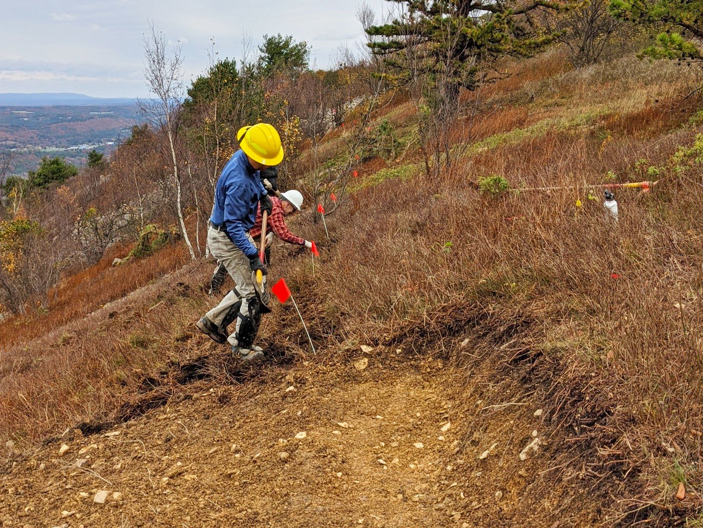 Where the A.T. skirts the town of Palmerton in eastern Pennsylvania, just north of Allentown near the Lehigh Gap, the Appalachian Trail Conservancy (ATC) is spearheading about 14 miles of ongoing Trail restoration, which will be built out over the next dozen years. The landscape is still recovering from the fallout from the nearby Palmerton Zinc Pile Site, a former zinc smelting operation, that had contaminated the ground for more than 80 years. Trees and plants are already growing back, and the landscape looks healthier than it did even five or 10 years ago. As part of the work, the Trail will be rerouted to areas of the ridgeline that are less likely to erode, thus ensuring further resilience of the Trail in the face of a changing climate and visitation pressures.
