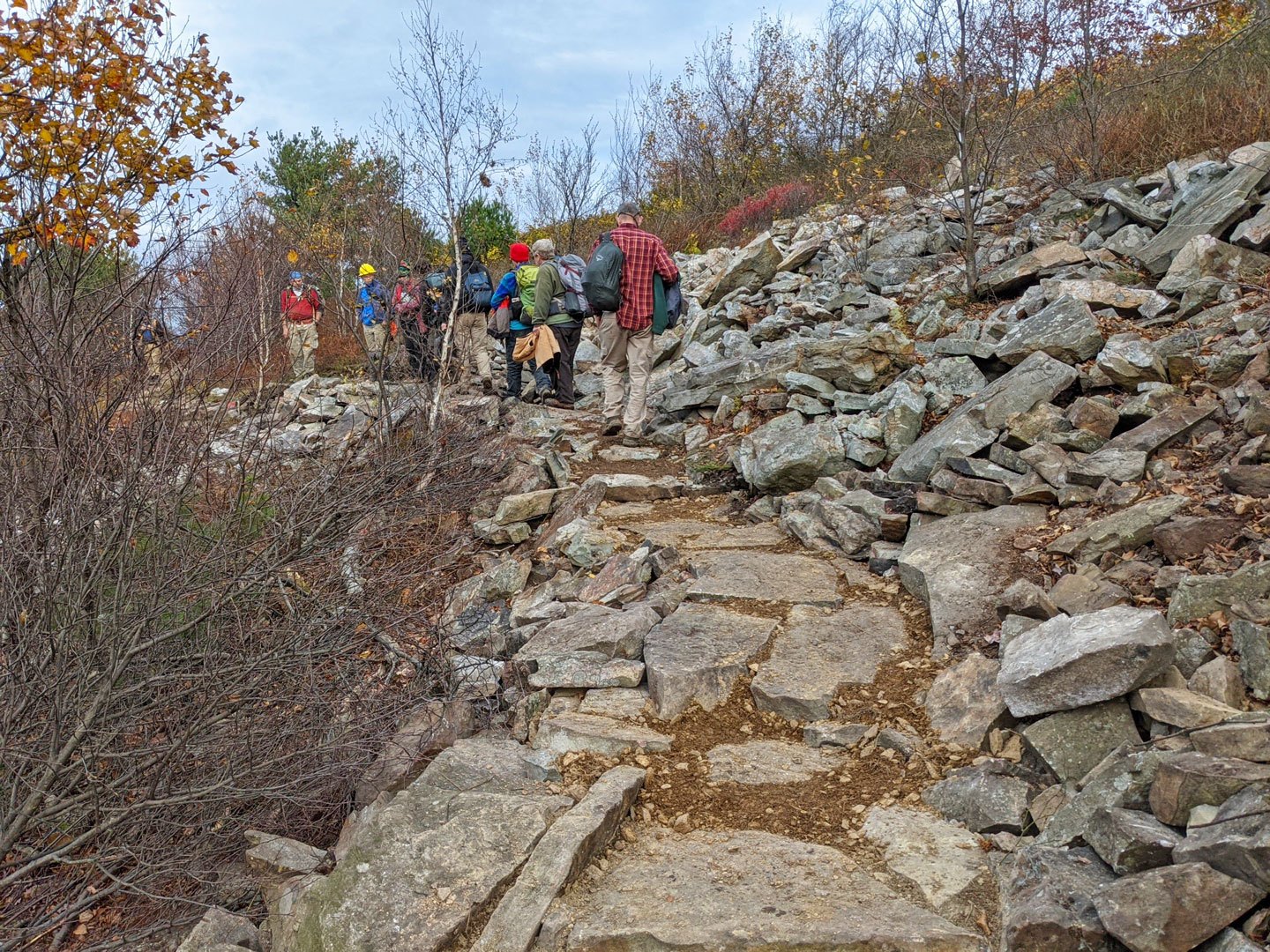 Hikers traverse the stone steps installed on the A.T. at Bear Mountain, New York.