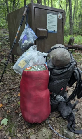 A.T. regulation note: Because of the risk unattended food and drinks pose to wildlife, it is illegal along almost the entire Trail to leave food unsecured. And it is illegal almost everywhere on the Trail to leave anything behind or unattended, even non-food items. This means that Ridgerunners often must report these items to land managers who remove them (or to the local Club who removes them on behalf of the land manager). Land managers are the agencies that own the land the Trail passes through, and they set and enforce regulations. Land managers along the A.T. include the USDA Forest Service, National Park Service, state parks, and more.