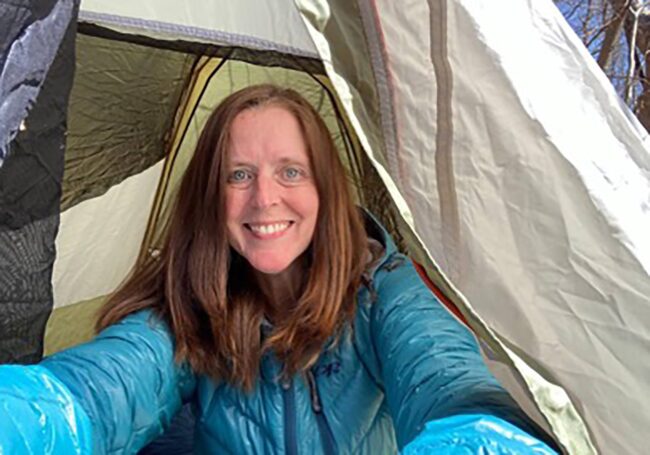 When invited, Kellie’s response was, “Yes. I need to sleep in the woods.” Crosses creek to stake out her own territory, “Kellielandia.” Only one of six not only to sleep all night, but to sleep in! Former diplomat and Georgetown grad who linked with the Potomac Appalachian Trail Club during college, spending spring breaks on the Appalachian Trail. Thirty plus years later, she’s glad to be backpacking again.