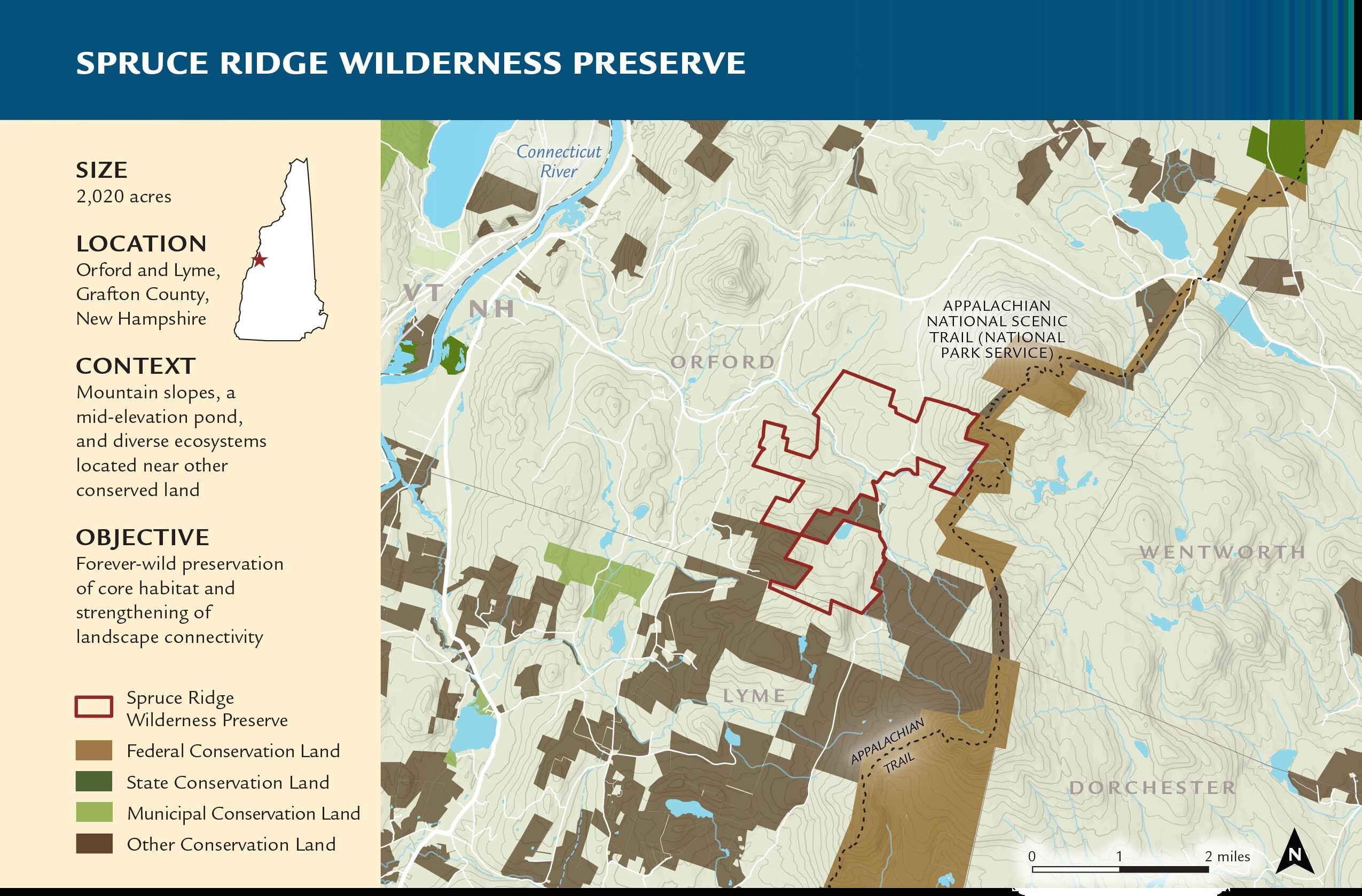 The grant funds will be used to help establish the Spruce Ridge Wilderness Preserve in Grafton County, NH — a 2,079-acre property that contains a 2.1 miles section of the A.T. and is home to over 30 acres of critical wetland habitat. The Wilderness Preserve will provide regional habitat connections, new public access opportunities, and increased protection of the Trail.