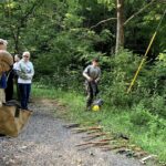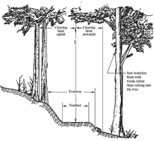 Brushing is a term used to describe the act of clearing a trail’s corridor from overgrown vegetation to a specific dimension. The Appalachian Trail Conservancy Fieldwork Handbook recommends a corridor that is cleared eight-feet in height and four-feet in width. The image below depicts corridor clearing and is from the MTDC: Trail Construction and Maintenance Notebook. As noted by the diagram it is a best practice for safety and visual aesthetics to cut branches flush to the branch bark collar.When out brushing a Trail and clearing it of blowdowns the following tools may be helpful: