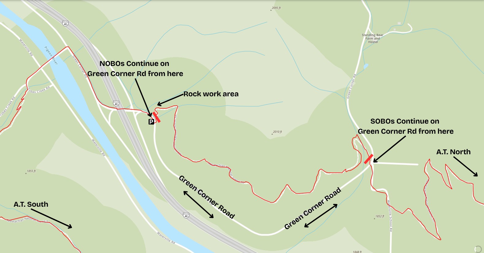 Hikers heading northbound (NOBO) will need to continue walking up Green Corner Road until they see the A.T. cut into the woods to the right at NOBO mile 241.8. Hikers heading southbound (SOBO) will need to turn left when they reach Green Corner Road, continuing on the road down to the I-40 area and rejoining the A.T at NOBO mile 241.3.