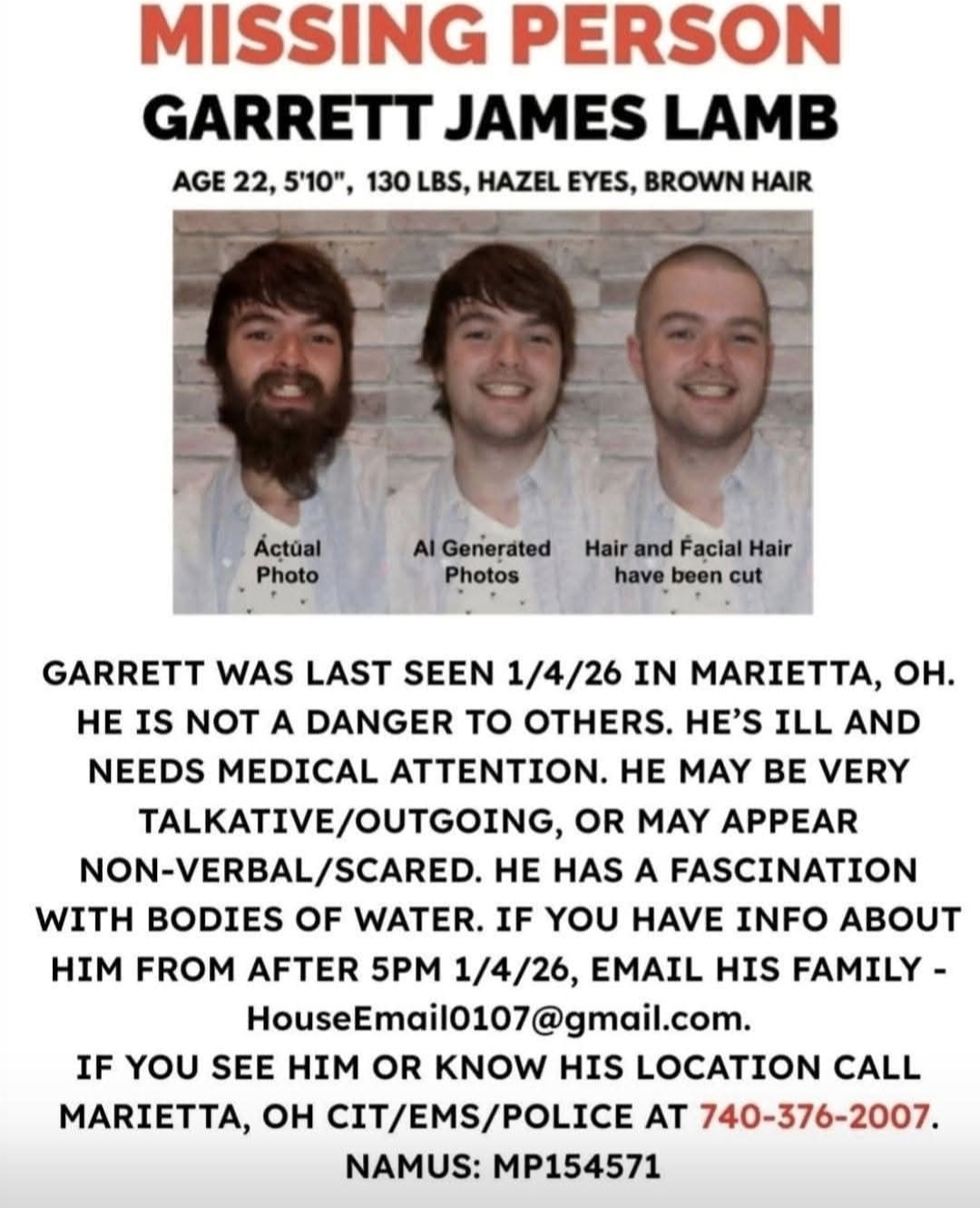 Garrett was last seen on January 4, 2026 in Marietta, Ohio. He is not a danger to others, but he is ill and needs medical attention. He may be very talkative/outgoing, or may appear scared/non-verbal. He has a fascination with bodies of water.