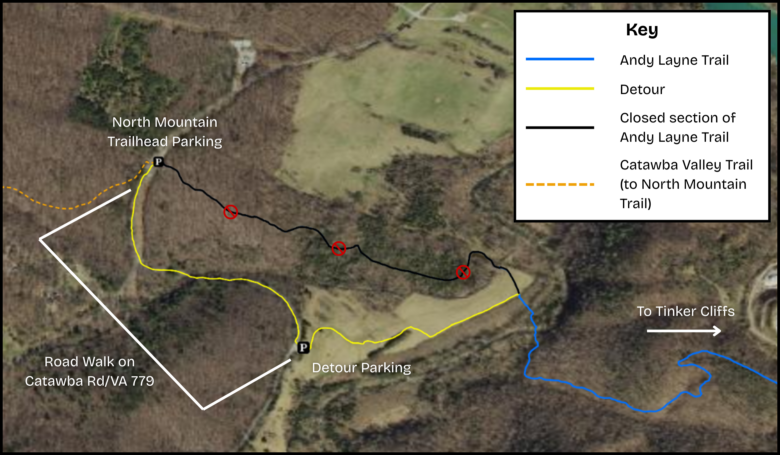 There is a temporary detour in effect for the lower portion of the Andy Layne Trail that routes hikers away from construction activities on Roanoke Cement property. The Andy Layne Trail is an Appalachian Trail (A.T.) side trail that provides access to Tinker Cliffs and is marked by blue blazes (NOBO mile 720.6).